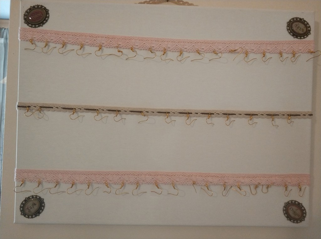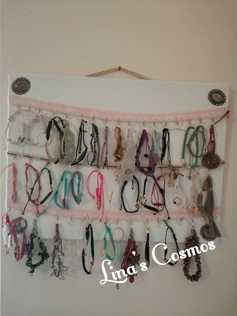 Λοιπόν από το Πάσχα και μετά φτιάχνω βραχιολάκια με μακραμέ, ούτε ξέρω και πόσα έκανα. Λέω χτες και που θα τα βάλω τρομάρα μου;; Είχα λοιπόν έναν καμβά φυλαγμένο (για ζωγραφική). Πέρασα σε δαντελίτσες (που τυλίγουμε δώρα) κλωστούλα, να στερεώσω γαντζάκια, ώστε να κρέμονται τα γατζάκια για να μπαίνουν τα βραχιόλια ή ό,τι άλλο θέλω να κρεμάσω. Τις δαντέλες τις στερέωσα στον καμβά με μικρές βίδες. Ένας άλλος τρόπος αν δεν έχεις καμβά είναι να ντύσεις μία κρεμάστρα με δαντέλα και να στερεώσεις γαντζάκια.